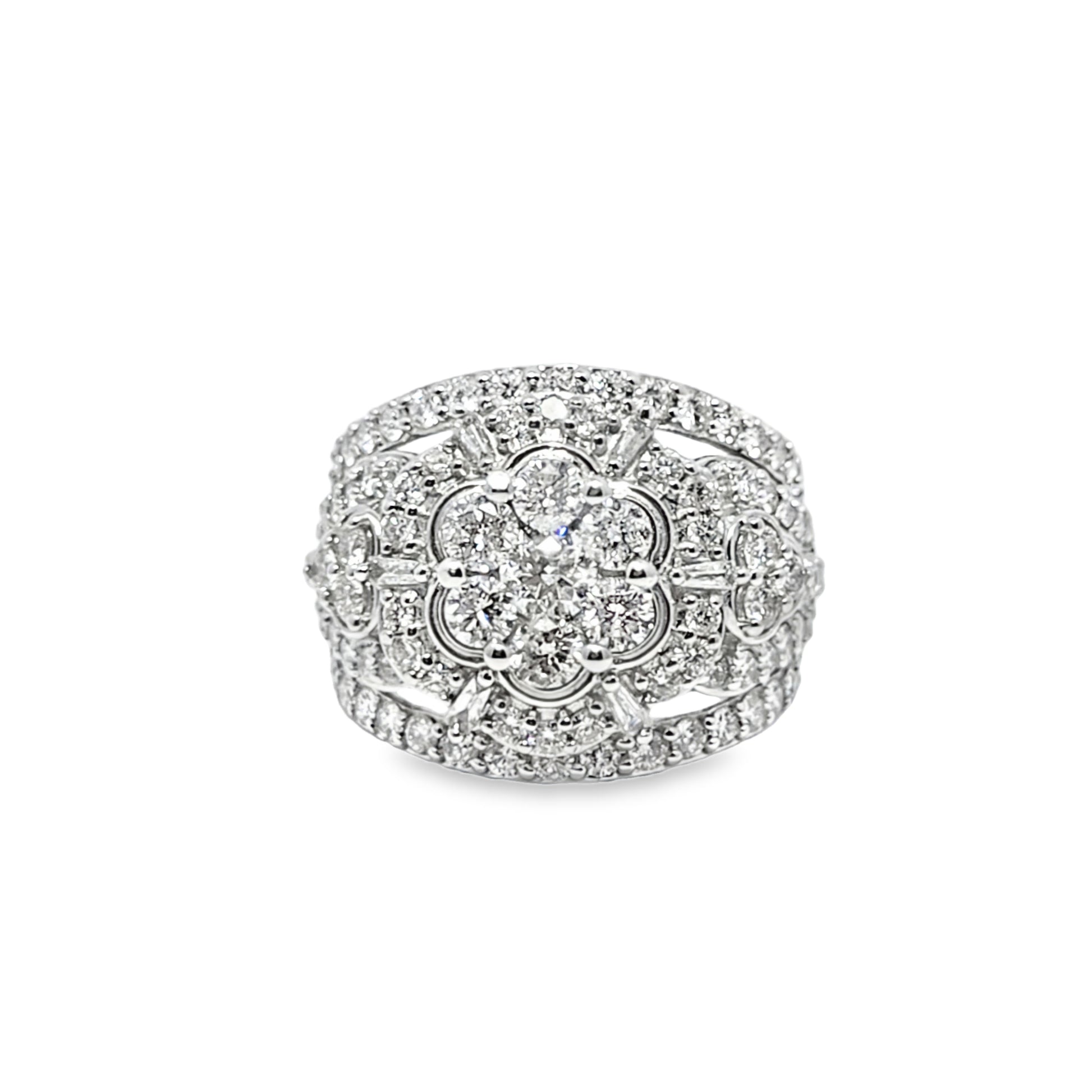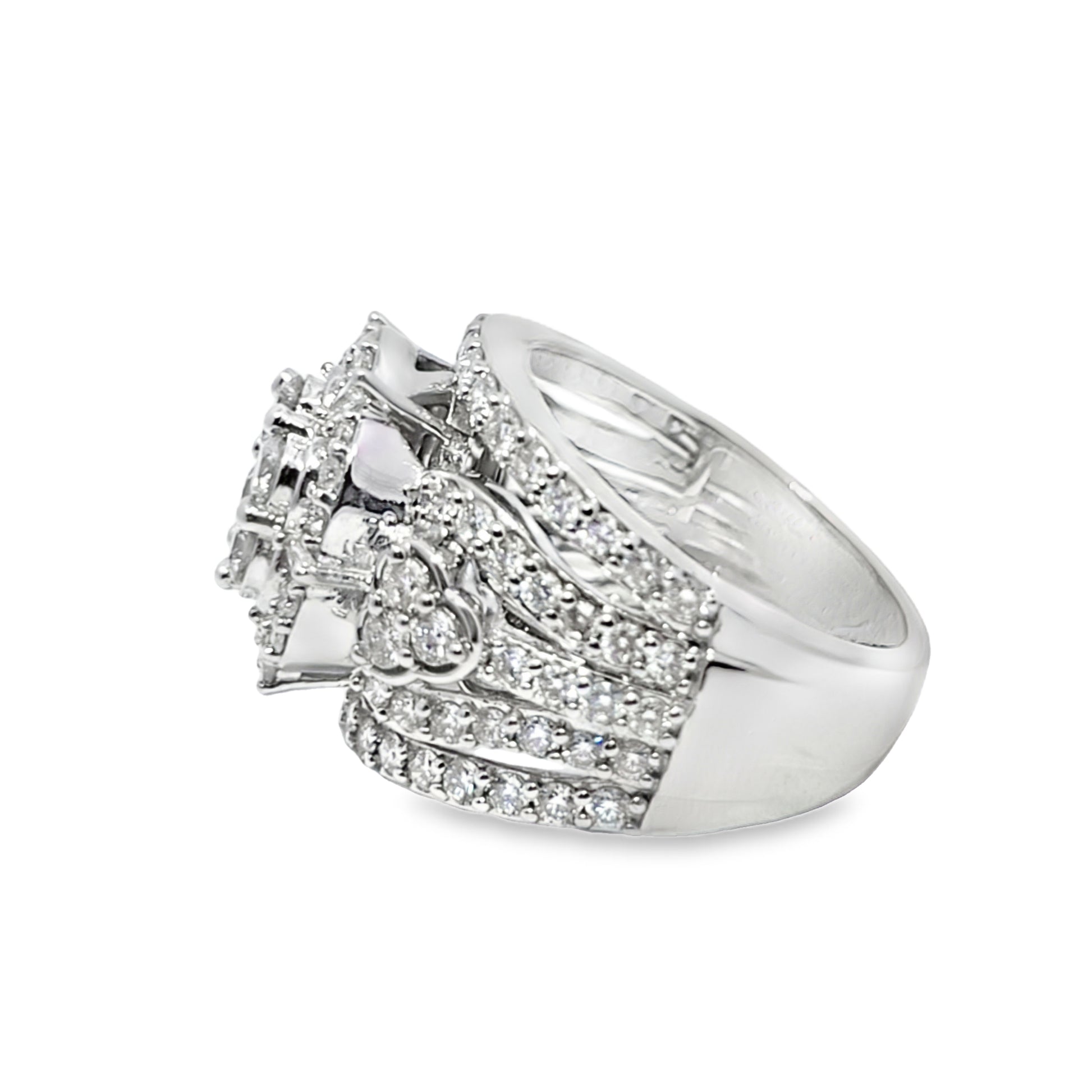Crafted in solid 14K white gold, the design showcases a floral-inspired diamond cluster centerpiece surrounded by multiple layers of round brilliant diamonds. The wide, split-shank band enhances sparkle and structure, offering a luxurious statement piece for any occasion.