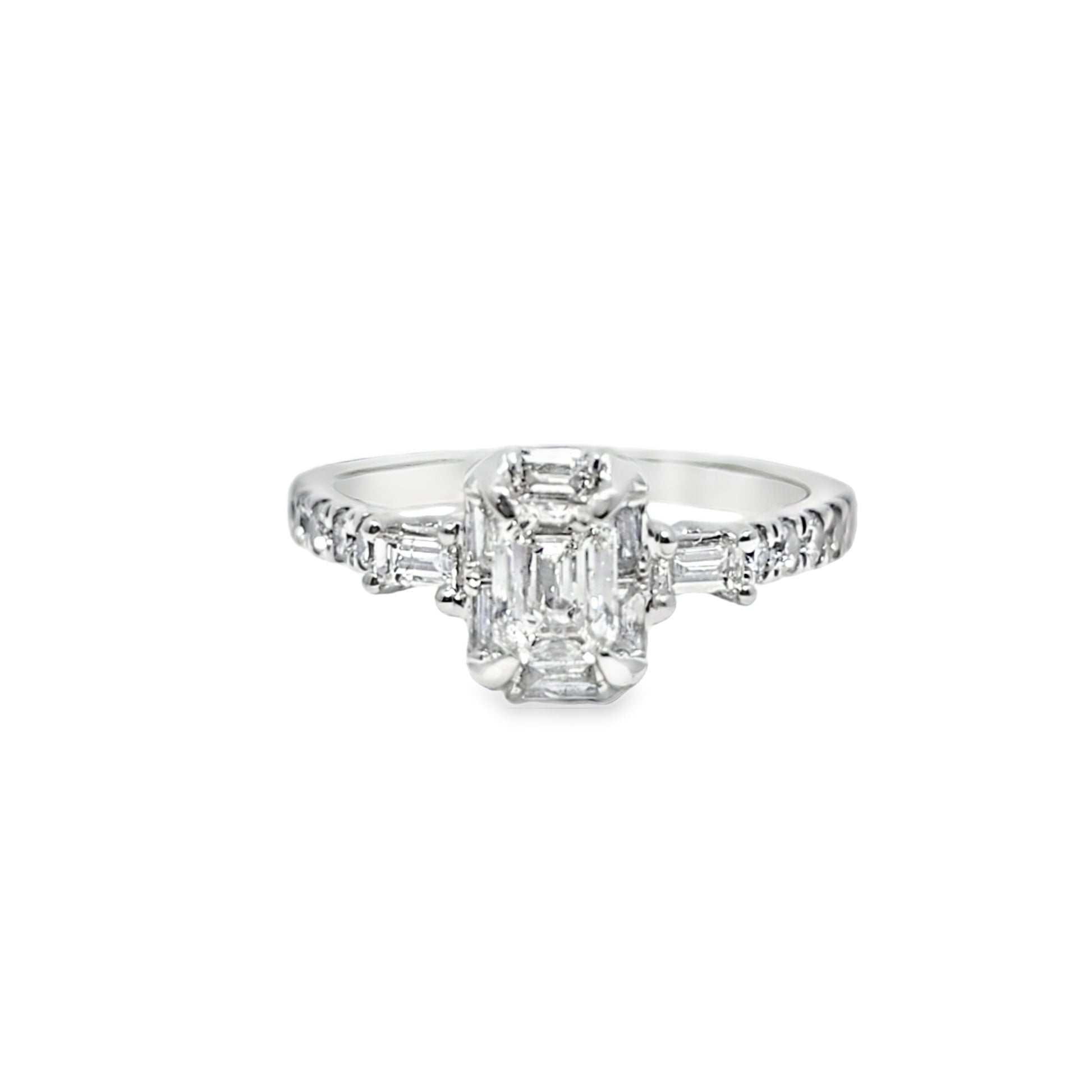 Expertly made in solid 14K white gold, the ring features a hand-set emerald-cut diamond as the centerpiece, accented with round brilliant side stones that add extra sparkle and depth. The clean lines and elongated shape of the emerald cut exude confidence, elegance, and refinement — making it an ideal choice for engagements or milestone occasions.