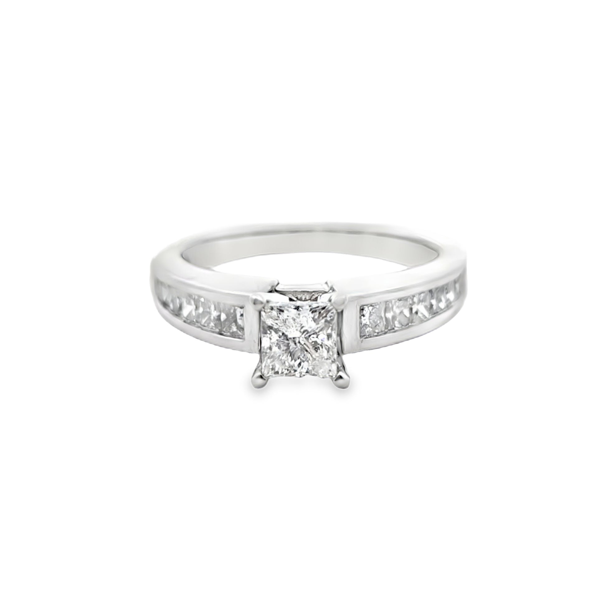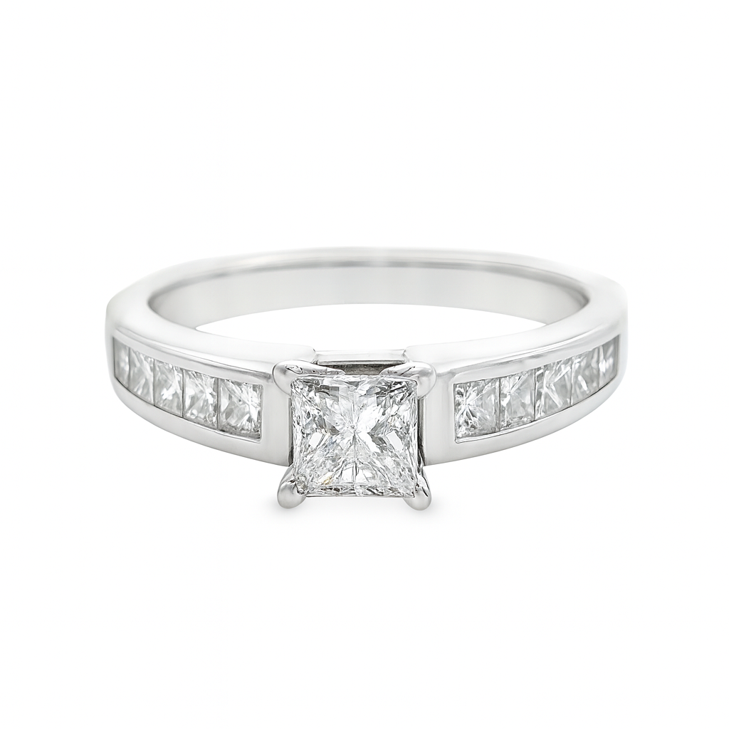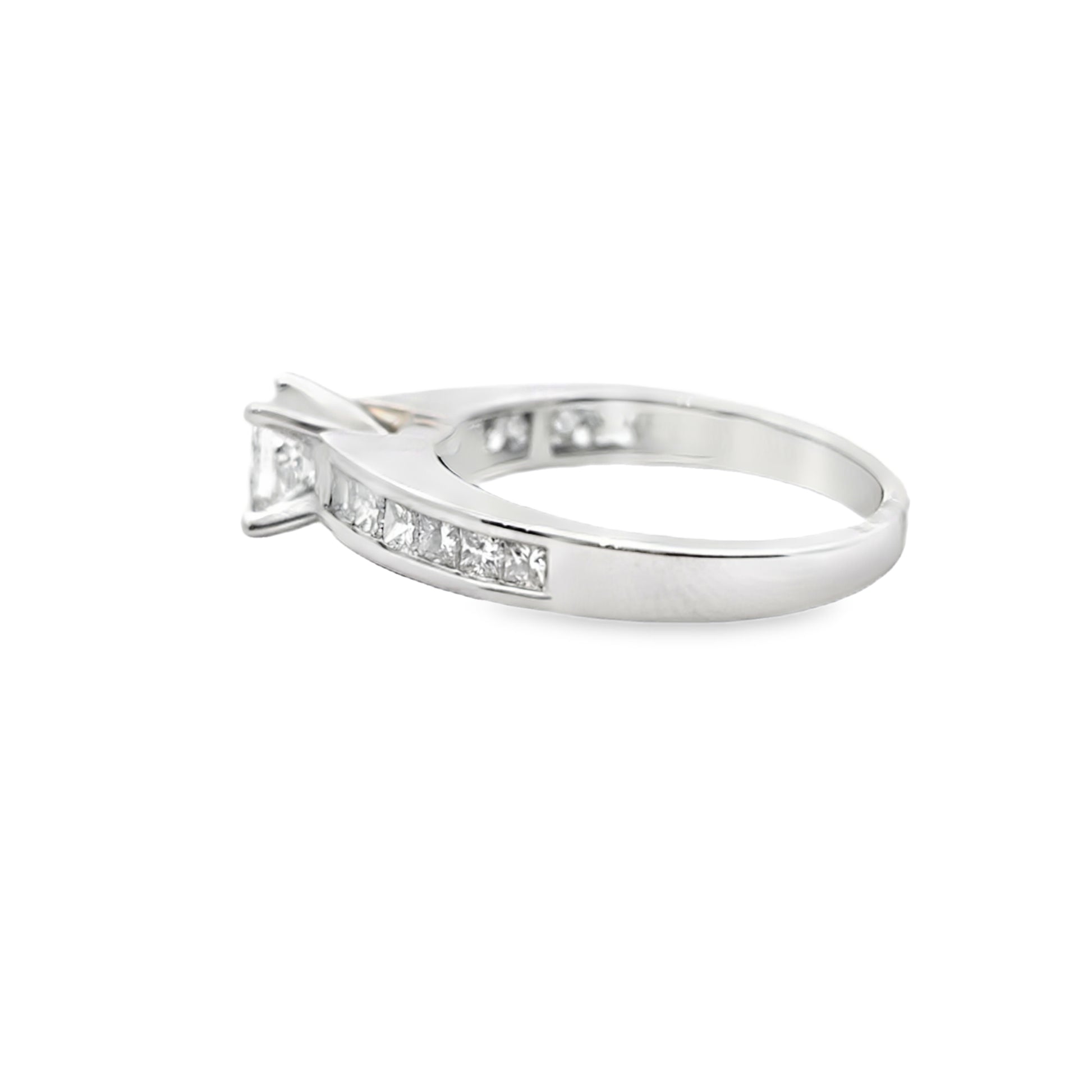 1.25 ctw of Diamonds: Centered with a brilliant princess cut, enhanced by channel-set side stones.