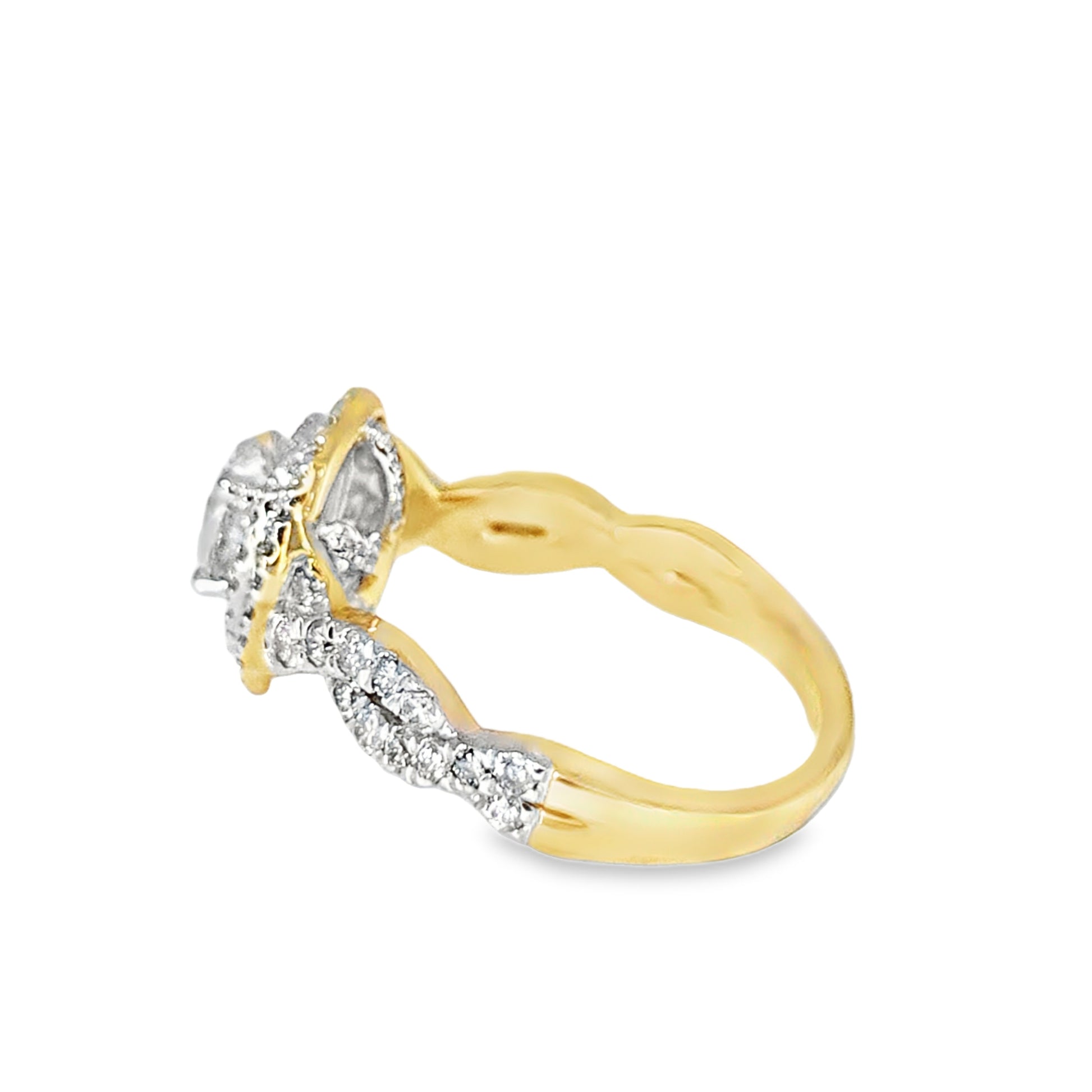 Expertly crafted in solid 14K yellow gold, the ring showcases a center oval cut diamond surrounded by a double halo of round cut diamonds that amplify its sparkle. The diamond-accented band adds depth and radiance, creating a captivating balance of warmth and shine.