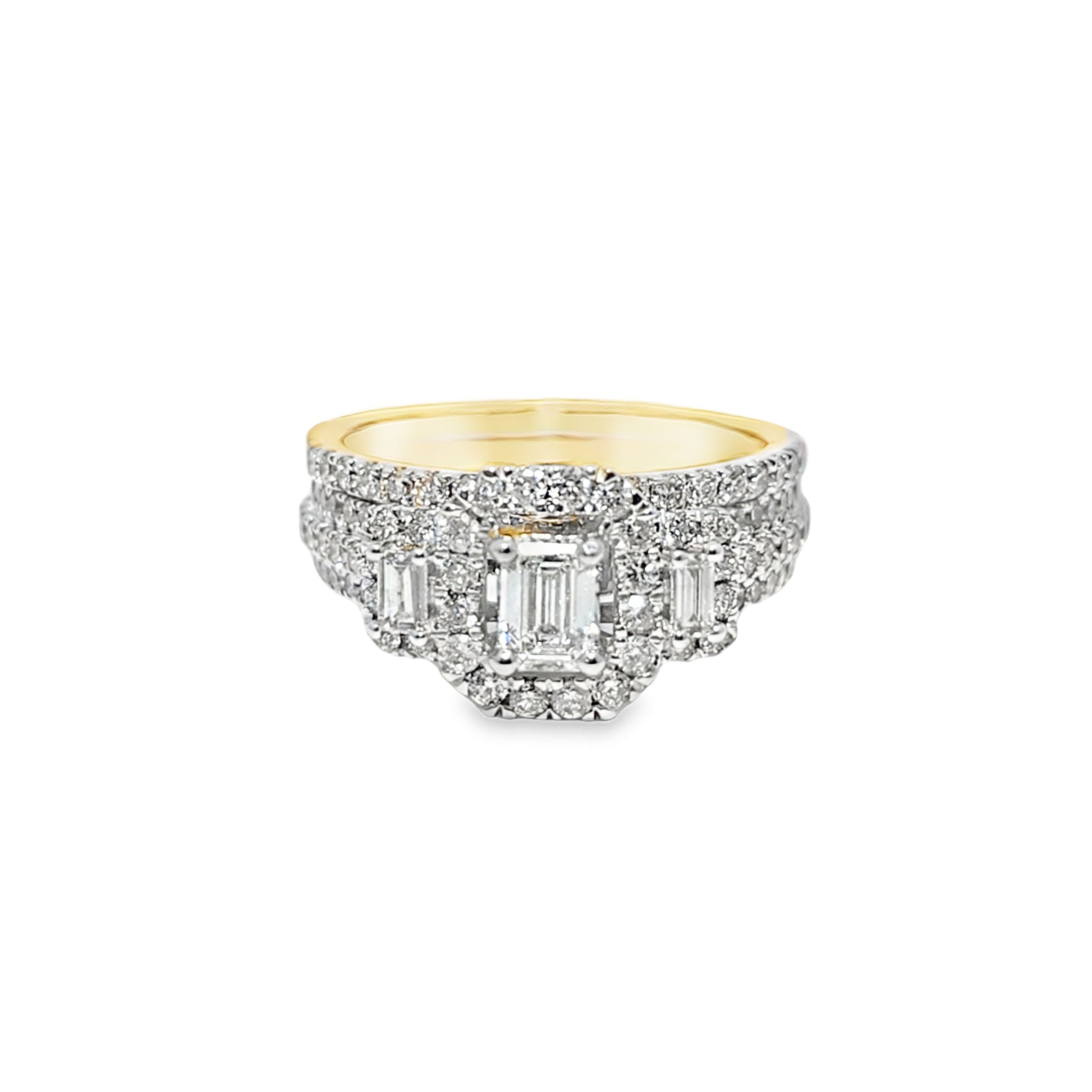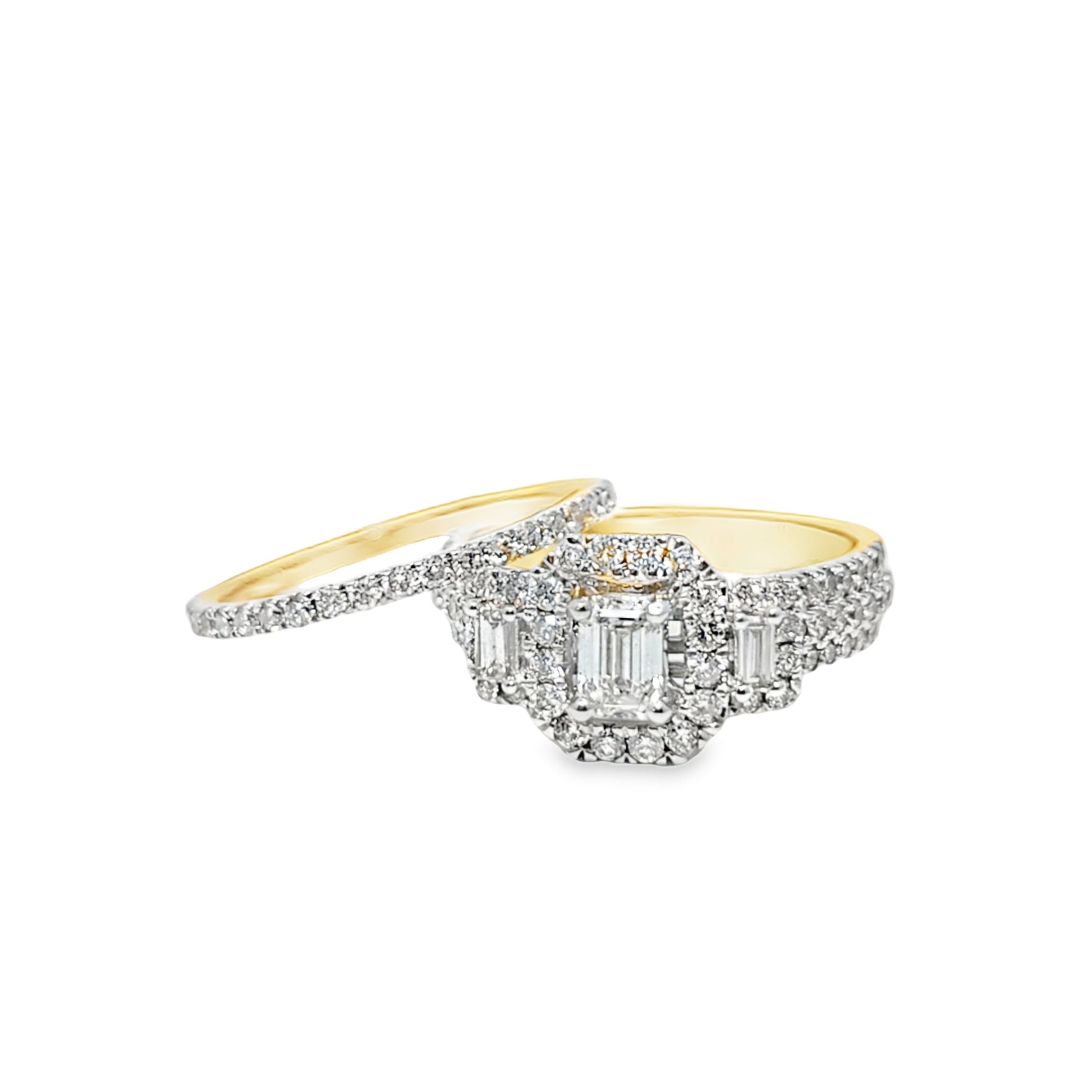 Expertly crafted in solid 14K yellow gold, the ring features a center emerald cut diamond framed by a halo of round cut diamonds, complemented by a matching diamond band for a flawless bridal pairing. The polished finish and precise stone setting create a captivating reflection of brilliance and sophistication.