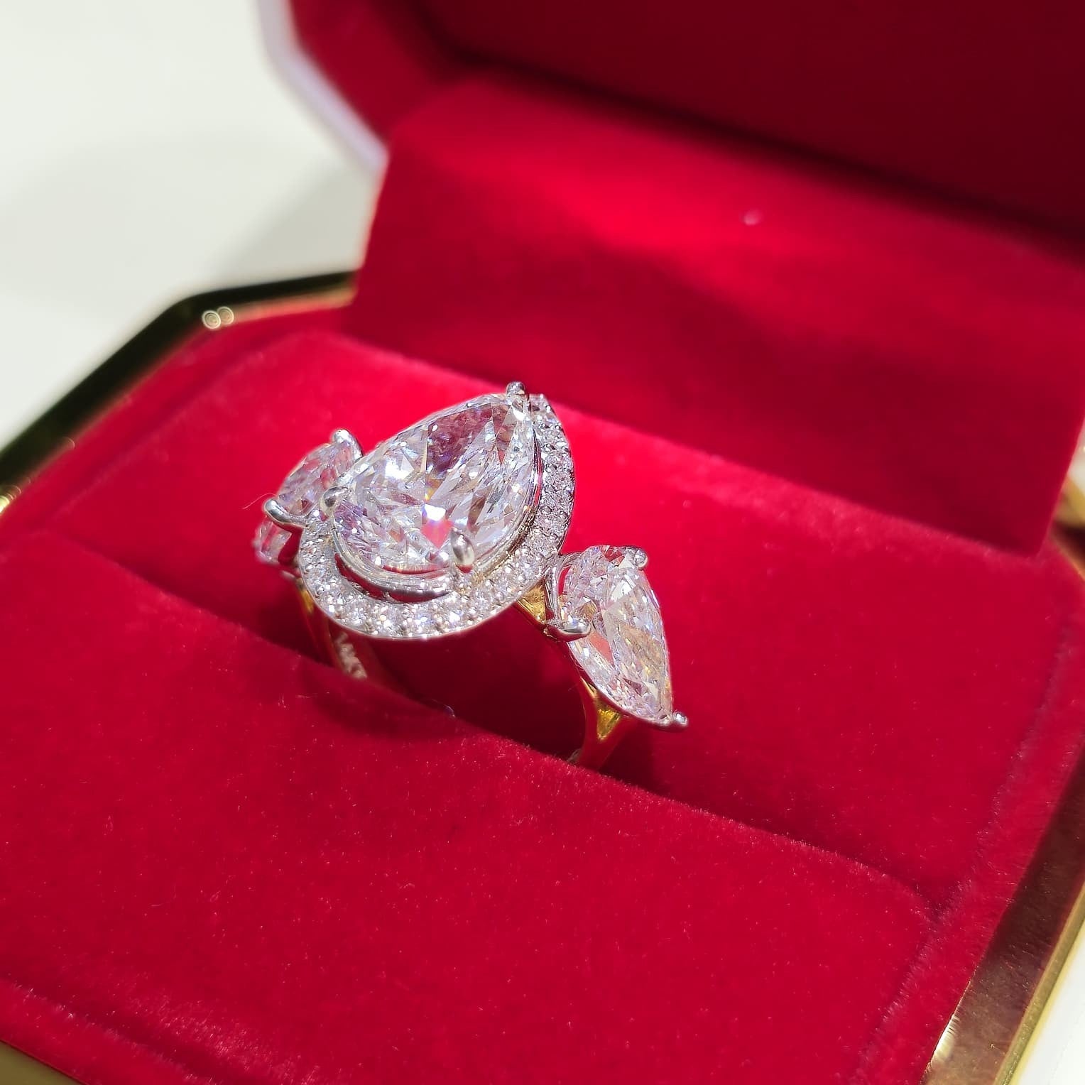 This exceptional 3-stone engagement ring is crafted in solid 14K gold and features a striking 5.00 CT pear-shaped lab grown diamond center , framed by a refined halo and balanced by two pear-shaped side diamonds .