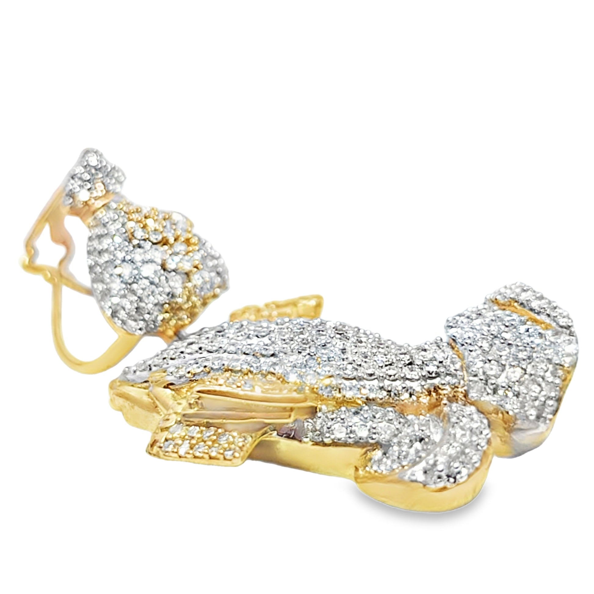 Make a statement of faith and success with this bold 10K Yellow Gold Diamond Praying Hands Pendant with Money Bag Bail, featuring 2.00 carats total weight of round brilliant diamonds. The detailed praying-hands motif symbolizes gratitude and devotion, while the money-bag bail adds a powerful touch of prosperity and ambition — a perfect blend of spirituality and street-luxury style.