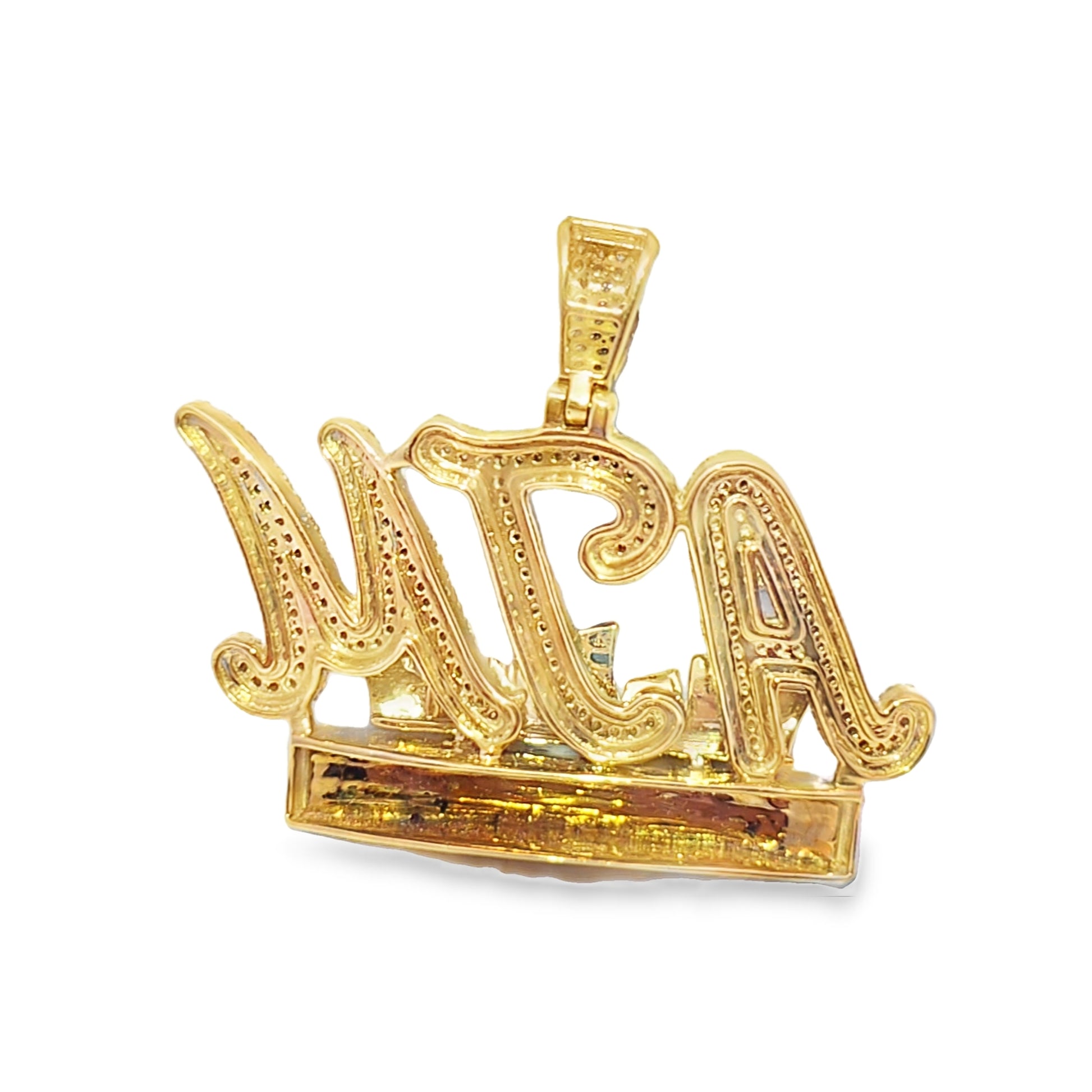 The 10K Yellow Gold Diamond “ATM Addicted To Money” Pendant (1.40 ctw) is crafted for those who wear success and hustle with pride. The bold “ATM” lettering, paired with a diamond-encrusted “Addicted To Money” banner, captures the essence of ambition and drive.