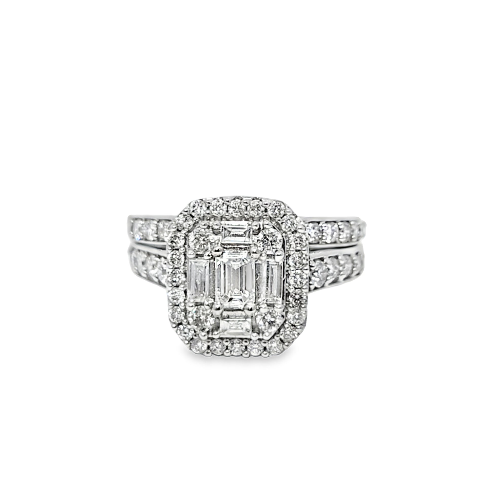 Expertly made in solid 14K white gold, the ring features a center emerald cut diamond cluster surrounded by a halo of round cut diamonds that enhance brilliance and depth. The matching diamond band adds balance and harmony, completing this luxurious bridal set with graceful sparkle.